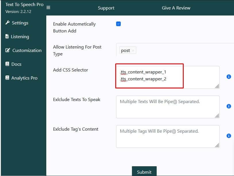 .tts_content_wrapper_1, each on a new line. - Submit Changes: Click “Submit” to save your settings.